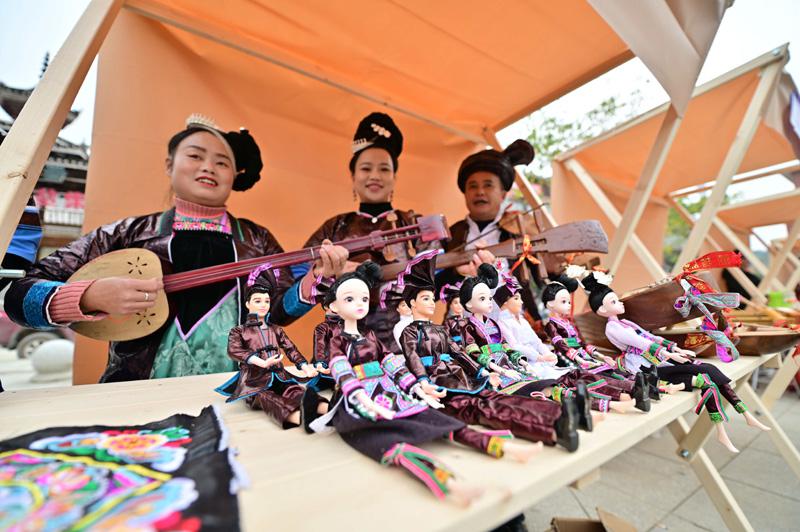 11月29日,侗族琵琶歌艺人在贵州省从江县周末非遗扶贫集市上一边展销非遗产品,一边表演侗族琵琶歌。新华社发(吴德军 摄)