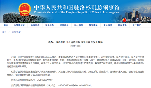 近期,多名中国留学生在洛杉矶国际机场入境时,遭美国边检执法人员反复盘问来美学习目的、过往学业成绩、是否曾经就业、是否受过纪律处分、是否“剽窃”实验室数据等情况,有的还遭到威胁、恐吓,甚至被限制自由长达数十小时,最终被拒绝入境遣返回国。此外,还有部分中国留学生离境回国时遭美执法人员盘查,被没收个人电子设备。我馆已就此向美方提出严正交涉,敦促美方纠正错误,停止利用各种借口对中国留学生进行无端限制和打压。