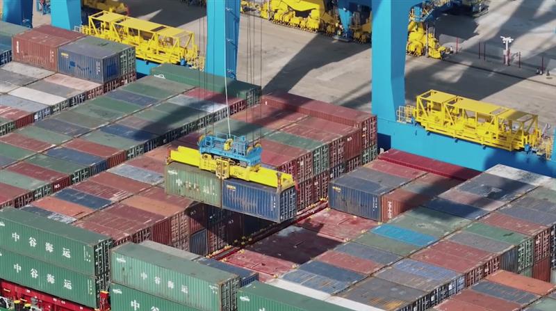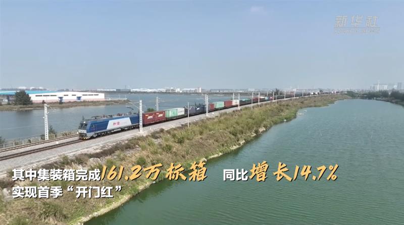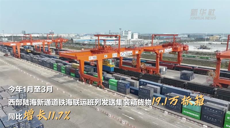 西部陆海新通道铁海联运班列载着香蕉干、食用植物油、椰汁等东盟特色产品,向川渝地区疾驰而去。