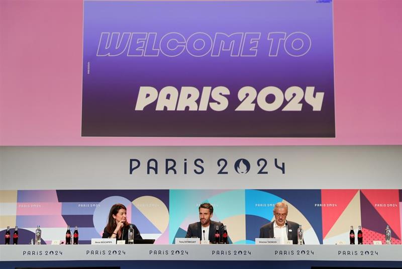 7月21日,巴黎奥组委主席托尼·埃斯坦盖(中)在发布会上发言。新华社记者 王东震 摄