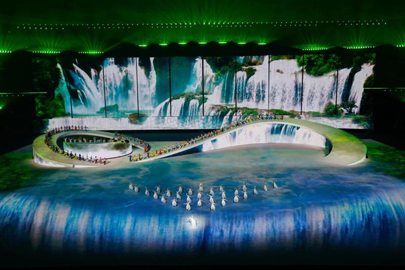 “唱山歌嘞,这边唱来那边和……”一叶扁舟、一行白鹭、一首山歌,带领大家进入青春山水、壮美广西、大美中国的诗意画卷。黄布倒影、漓江双月、德天瀑布……壮美山水通过舞美、灯光,在主舞台上呈现。