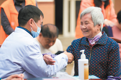 浙江省湖州市德清县洛舍镇养老服务中心,党员志愿者为老人检查身体。王 正摄(影像中国)