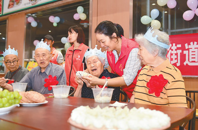 河南省洛阳市涧西区重庆路街道二社区的党员志愿者们,在社区乐养居服务中心为老人们送上重阳节爱心蛋糕。黄政伟摄(影像中国)