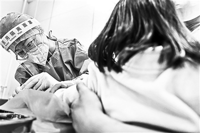 5月9日,北京协和医院急诊科发热门诊护士为一名儿童采指血 供图/新华社