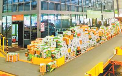 江西赣州寻乌县供销电商公司的快递物流服务提高了农产品流通效率。图为该公司电商运营中心等待配送的商品。 |