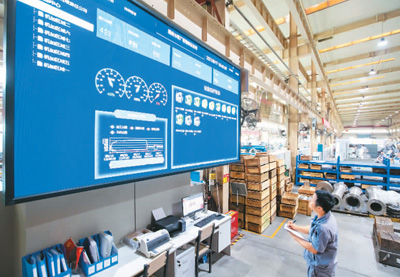 重庆市沙坪坝区打造“科创智核”创新驱动,并大力发展高端装备制造、互联网新能源汽车、新材料等战略性新兴产业。图为8月17日,位于沙坪坝区某公司的数字化生产车间内,工人正在查看设备监控系统大屏。 |