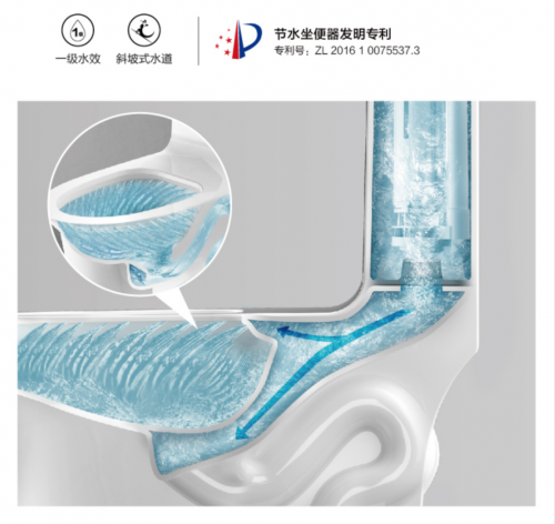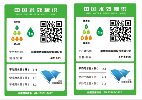 我们以箭牌卫浴入选的产品AB1295和AB1183为例,全新冲水结构设计,提升下水高度,增加水的重力势能,斜坡式下流水道,减少势能流失,单次平均用水量为3.6L,比国家一级水效等级产品平均用水量4L还要低。