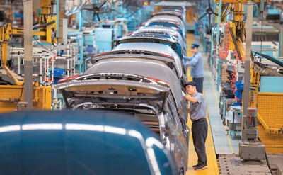 10月11日,海南省海口市某汽车基地的生产车间内,工作人员在新能源车生产线上作业。