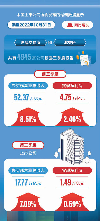 上市公司运行情况是观察中国经济的窗口之一。中国上市公司协会近日发布的最新数据显示,截至2022年10月31日,沪深交易所和北交所共有4945家公司披露三季度报告,前三季度共实现营业总收入52.37万亿元,占GDP总额的60.18%,同比增长8.51%;实现净利润4.75万亿元,同比增长2.46%。总体来看,尽管面临多重压力,但上市公司前三季度依然交出了一份来之不易的成绩单。