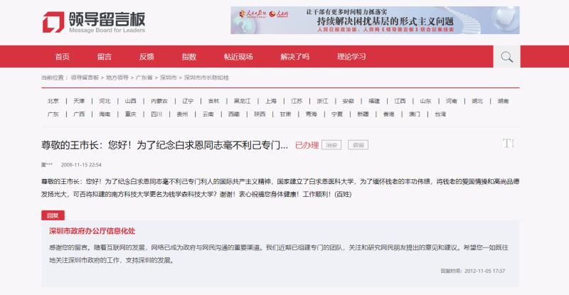 而早在2009年,就曾有网友在人民网领导留言板上建议,为了纪念白求恩同志毫不利己专门利人的国际共产主义精神,国家建立了白求恩医科大学,为了缅怀钱老的丰功伟绩,将钱老的爱国情操和高尚品德发扬光大,可否将拟建的南方科技大学更名为钱学森科技大学?对此,深圳市政府办公厅信息化处则在2012年回复:“我们近期已组建专门的团队,关注和研究网民朋友提出的意见和建议。”