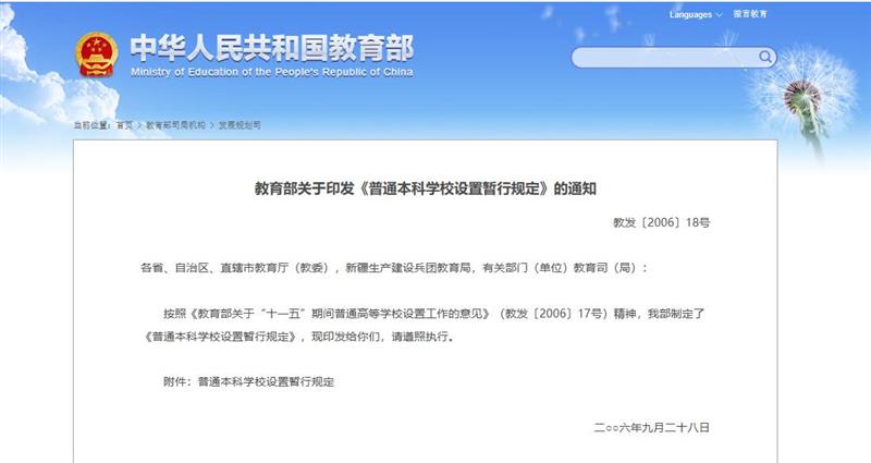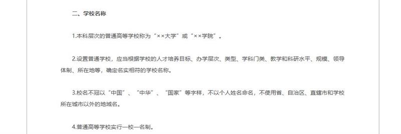 而按照《教育部关于“十一五”期间普通高等学校设置工作的意见》(教发〔2006〕17号)精神,教育部2006年制定印发了《普通本科学校设置暂行规定》, 其中第二大点关于“学校名称”的第3条规定:校名不冠以“中国”“中华”“国家”等字样,不以个人姓名命名,不使用省、自治区、直辖市和学校所在城市以外的地域名。