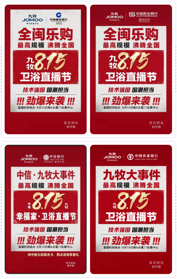此外,九牧科技普惠民生,除了推出“1元抵100元”、“10点抢秒杀”、“好友拼团最高立省500元”等劲爆让利活动外,还携手建设银行、农业银行、民生银行、中信银行狂派惊喜!九牧还将携手中信银行联合发布“安居乐业——银联芯片借记卡”,打造全新消费体验,护航美好幸福生活。