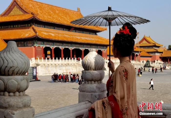 资料图:11月6日,游客穿着各式古装在北京故宫游览。今年是紫禁城建成600周年,越来越多的游客热衷于着古装游览。 中新社记者张宇 摄