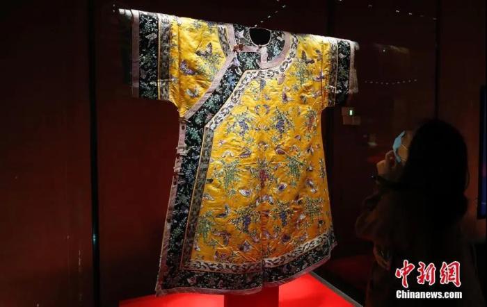 图为观众参观"明黄色缎绣藤萝纹夹衬衣(清光绪)"。中新社记者杜洋 摄
