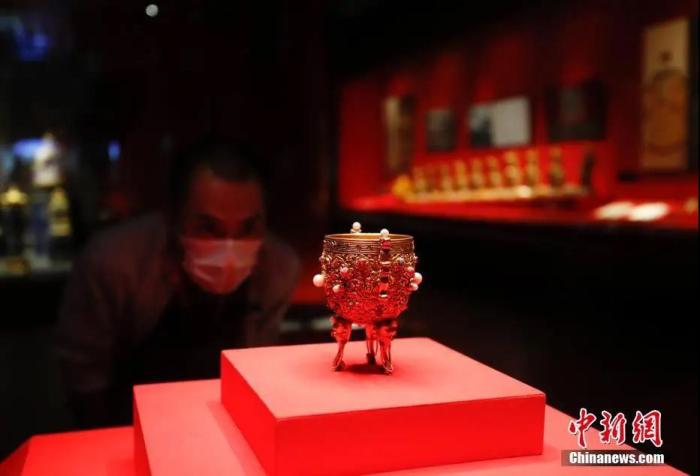 图为游客参观金嵌珠石金瓯永固杯。中新社记者 杜洋 摄