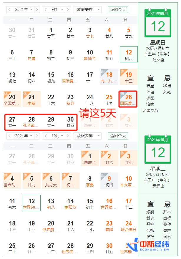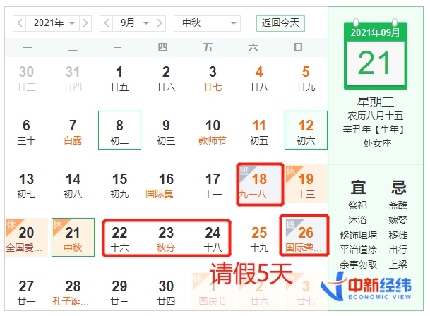 今年中秋假期的放假时间为9月19日至21日,9月18日(星期六)则要上班。3天时间适合短途旅行,如果在9月18日、9月22日至24日、9月26日(星期日上班)这5天请假,加上9月25日(星期六),就能拼出一个长达9天的假期。