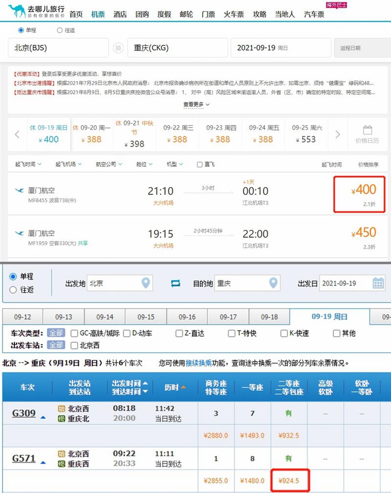 9月19日北京-重庆机票、高铁价格对比