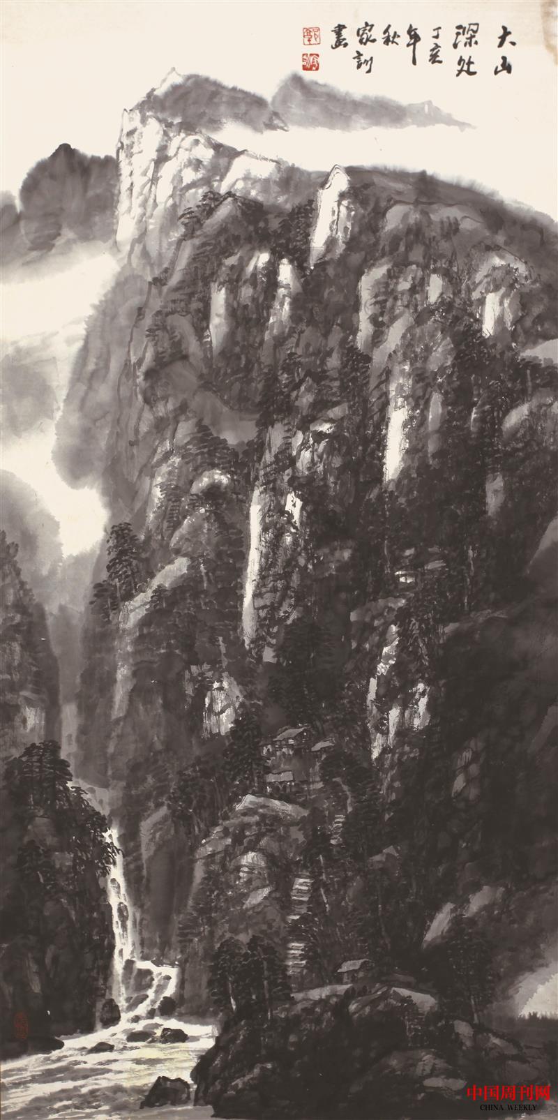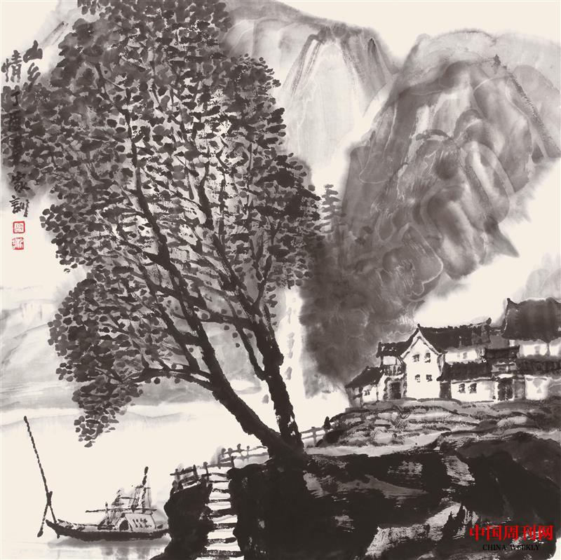 《源》是实景写境,山色翠绿,崇山环抱中,一条清溪涌现,高处云蒸雾绕。人们从中感受这里瀑布的激荡和大山深处的回响。《相思树下》表现古树苍茂,青藤环绕,流水成河,一个村姑在竹排上用手机与远方的情郎通话,情意绵绵。郭家训对水钟情,表现水的能力也很突出,这也丰富了大山的灵魂。类似的作品还有《暮归》,这幅作品主要表现水流直下,奔腾不息,作品远处,石拱桥上有牧归的牛羊,流水两边是秀石小村,作品取景生动。《山道弯弯》山势雄奇险峻,群峰叠翠,虽然山路曲折崎岖,但是仍然通达远方,寓意山民走出大山寻求光明。画中树木湿润,作品中运笔灵动,墨色浓淡有法,体现大山的质感与生机。这些作品或是他童年的寄托,或是他多次写生提炼的再创作。生活之中不缺少美,而是缺少审美的眼睛。郭家训有一双明眸,钟情云贵大山,并用水墨山水画作表现对故乡的深情,给人林泉高致的美感。他是黔贵大山画界的“骄子”。