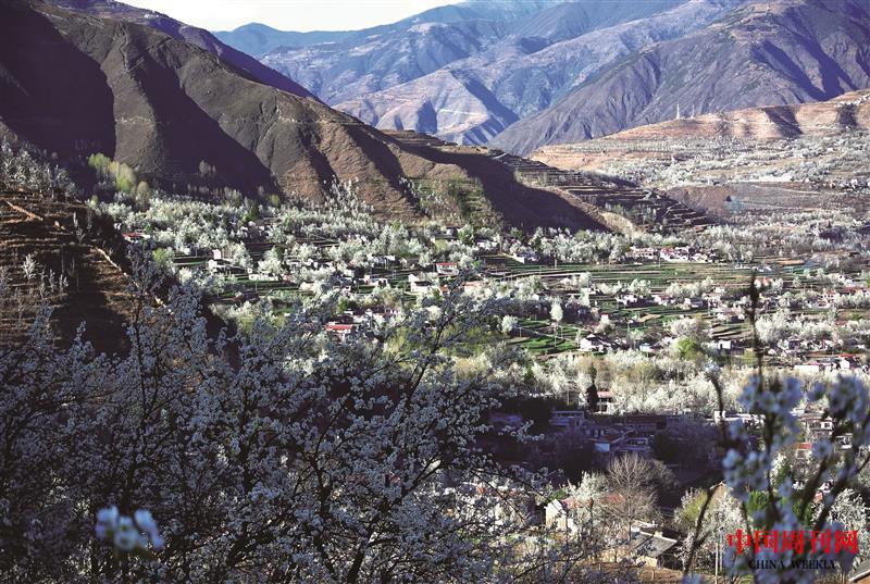 金川是梨花的世界,喜欢梨花,便容易被梨花感动,感动于花开枝头的端庄与短暂,感动于洁白如雪、临风而舞的一袭纯白。看到金川的梨花,便想起诗人白居易形容杨贵妃“梨花一枝春带雨”的名句。杨贵妃是著名的美人,杨美人心情不好的时候会玉容寂寞,泪水纵横,白居易便以带雨的梨花来比喻她。这句比喻便成了千古一绝,给我们留下了杨贵妃极美的形象和让人难以形容的心动。