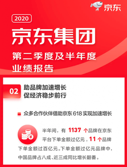 财报显示,第二季度,京东集团实现净收入2011亿元人民币,首次实现单季净收入破2000亿元人民币,创中国零售及互联网行业单季净收入新纪录,同比增长33.8%,这一增速创下公司近10个季度以来的新高。截至2020年6月30日,1137个品牌在京东平台下单金额过亿元,京东成为国内外品牌的最大增量场。其中,B端市场正日渐成为京东增长的新引擎。
