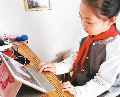 山东省青岛市四方小学的学生刘腾鸢通过“空中课堂”学习文化课。 |