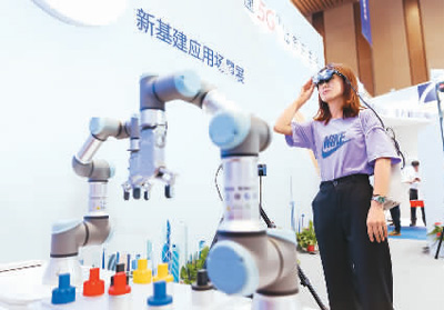 参观者在江苏省南通市新基建应用场景展上体验通过基于5G的人工智能技术操控机械臂。 |