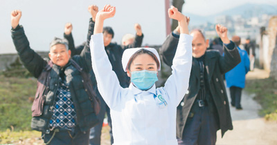 1月14日,贵州省毕节市黔西县金碧镇卫生院医养中心医护人员,在指导老人进行康复训练。周训超摄(人民视觉)