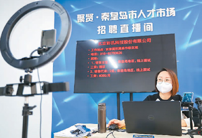 1月22日, 秦皇岛市聚贤人才市场工作人员使用网络直播平台为符合认定条件的就业困难人员、残疾登记失业人员等求职者介绍相关工作。