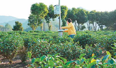 2020年12月31日,福建福安,工作人员查看智慧茶园中的病虫害监测仪器。