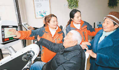 2020年12月8日,在重庆一家“智慧养老”服务站内,服务人员为老人指导智能健身器材的使用技巧。