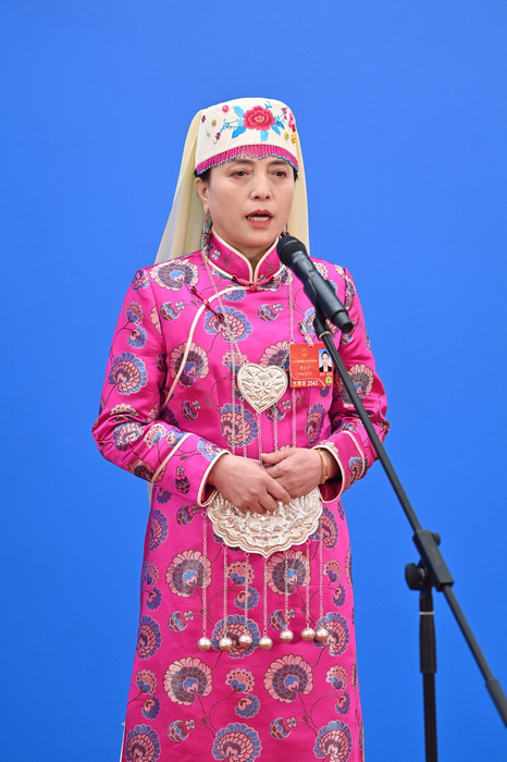 全国人大代表夏吾卓玛通过网络视频方式接受采访。