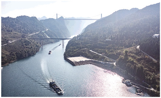 近年来,构皮滩、思林、沙沱电站大型升船机相继投入运行,乌江水道全面贯通。2021年11月,贵阳港开阳港区北上长江首航,14艘货船运载6800吨磷矿,从贵阳港开阳港区出发,前往重庆涪陵。这标志着乌江“黄金水道”全线大规模复航,500吨级船舶可直达长江。