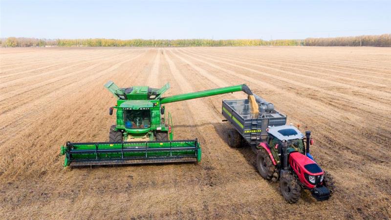 在黑龙江北大荒农业股份有限公司友谊分公司的一处豆地内,收割机正沿着整齐的地垄来回穿梭。“今年种了2000多亩大豆,亩产440多斤,是个大丰收年。”种植户孙德强抓起一把金黄饱满的大豆,笑得合不拢嘴。