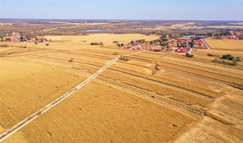 10月13日,这是通辽市奈曼旗义隆永镇方家营子村待收的玉米。(无人机照片 新华社记者连振 摄)