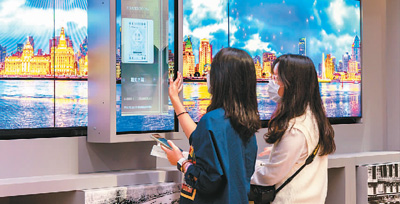市民在上海图书馆东馆体验“影话外滩”多媒体装置。王 初摄(人民图片)
