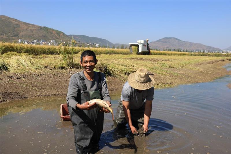会泽县娜姑镇白雾村村民在抓稻田鱼。(新华社发)