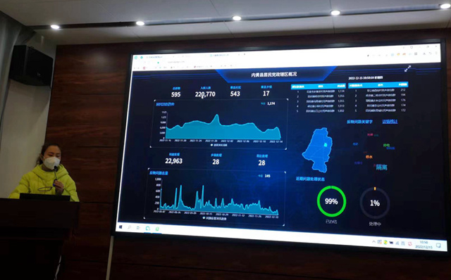 技术人员介绍,管理系统共分为微信群概况、智能管理、问题处置、安全管理、数据驾驶舱和系统管理六个模块。其中,单微信群概况模块,就包括村群情况、问题统计、群活跃度三项。从后台中,工作人员可以看到17个乡(镇)的问题总量、未办理总量及超时任务数等,能充分了解各乡(镇)微信群使用情况,“单单一个群活跃度,我们就可从侧面看出干部的工作作风,是不是敢于担当作为、直面群众问题。对活跃度较低的村,我们还会按照《微信群考核办法》对相关责任人进行约谈,避免让微信群成为僵尸群。”王青霞说。