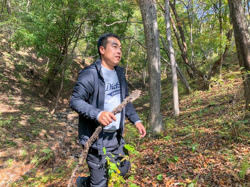 2022年9月19日,梁铖龙在山里查看养鸡围场情况。(受访者供图)