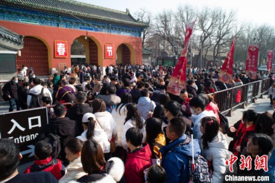2月13日,农历正月初四,北京天坛公园门口的游客排队入园。 中新社记者 盛佳鹏 摄