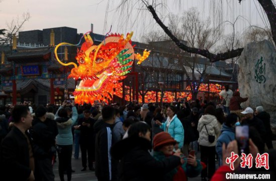 2月17日,春节假期最后一天,民众来到北京什刹海畔参观巨型龙灯。 中新社记者 易海菲 摄