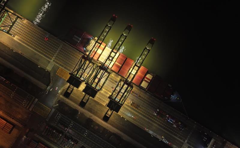 2024年1月16日,大型集装箱班轮“巴赫”号靠泊在天津港太平洋国际集装箱码头(无人机照片)。新华社记者 赵子硕 摄