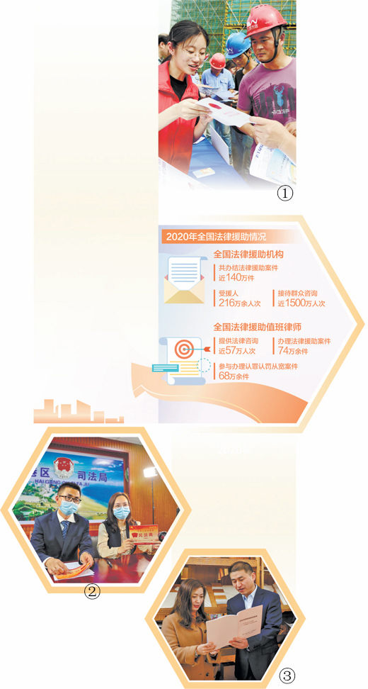 为农民工讨薪,维护妇女、儿童合法权益……法律援助工作着力解决困难群众最关心、最直接、最现实的利益问题,让困难群众平等获得法律保护,是一项民生工程,也是服务保障和改善民生的重要方式和途径。据不完全统计,仅2020年,全国法律援助机构共办结法律援助案件近140万件,受援人达216万余人次,接待群众咨询近1500万人次,有效维护了受援群众的合法权益。