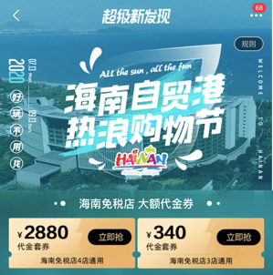 海南自贸港建设如火如荼,免税新政更让国际旅游岛魅力升级。7月14日,飞猪联合支付宝发放30万张海南免税消费券,可用于海南的各免税店。同时,包含百万红包补贴、超值酒店度假产品在内的“海南自贸港 热浪购物节”也同步上线。