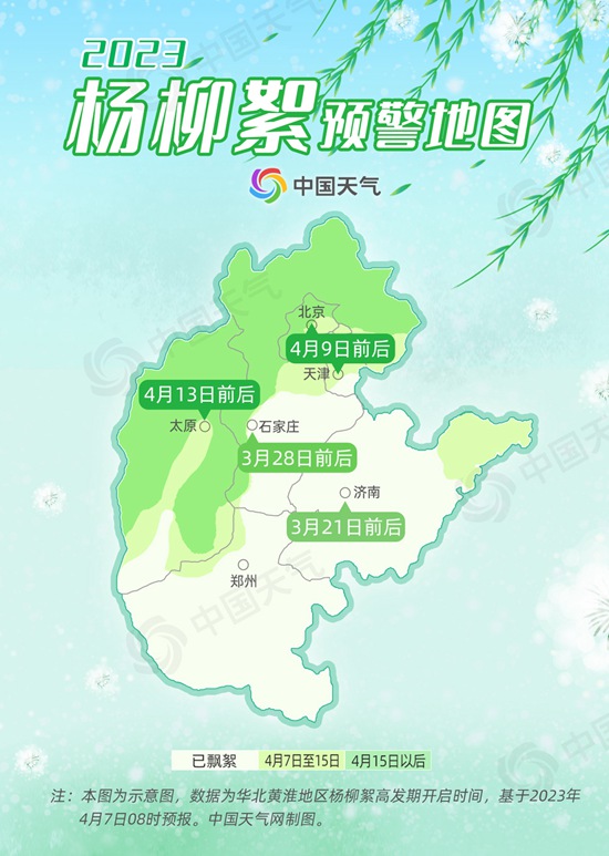 以华北地区最早开始飘絮的白毛杨为例,当日平均气温大于0℃时,白毛杨才能正常生长发育,将这些超过0℃的数值累加起来,当总和达到480℃,且日平均气温达到14℃,杨絮就开始飘飞。华北一带,往往4月上旬前后达到这一标准,杨絮飘飞。杨絮飘飞10余天后,柳絮也会进入飘飞期。