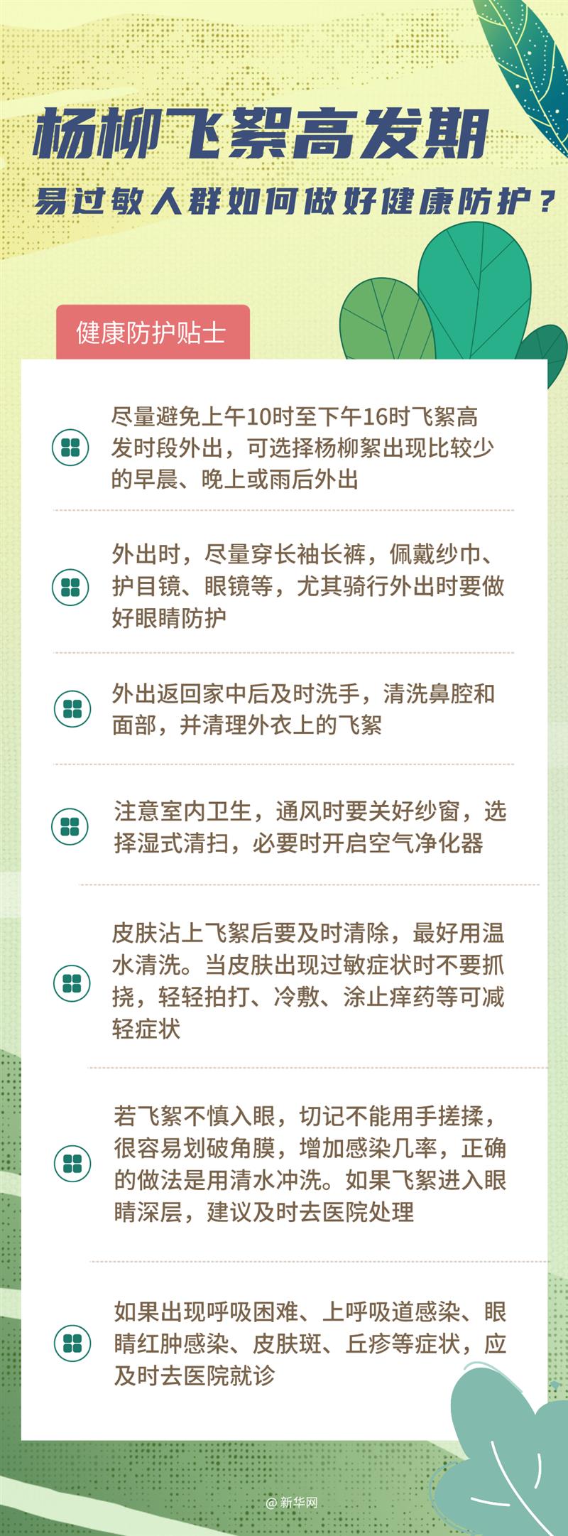 杨柳飞絮会引起部分人群过敏,出现嗓子干涩、眼睛红肿感染、皮肤斑、丘疹等症状。在飞絮高发期做好健康防护很重要。