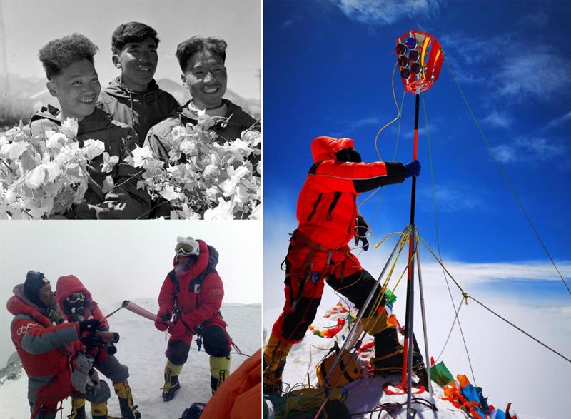 拼版照片:左上图为1960年5月登上珠穆朗玛峰峰顶的中国登山队队员王富洲(右)、贡布(中)和屈银华(资料照片,新华社发);左下图为2008年5月8日,北京奥运圣火珠峰传递登山队队员罗布占堆(左)点燃第一棒火炬手吉吉手中的“祥云”火炬(新华社发);右图为2020珠峰高程测量登山队队员在珠穆朗玛峰峰顶开展测量工作(2020年5月27日新华社特约记者扎西次仁摄)