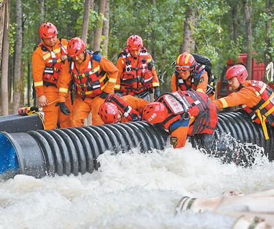 8月6日,在河北省涿州市刁窝镇东张村,唐山消防救援支队队员进行排涝作业。 |