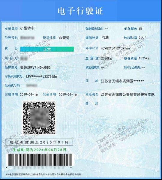 网上在线办理业务需要提交行驶证的,用户可选择下载电子行驶证图片。具体操作为:点击电子行驶证下方【下载】按钮,本人直接出示的填写用途事项和有效期后下载,授权出示的直接下载。下载的电子行驶证加注使用人、用途事项和有效期限水印,有效期最长为7个工作日。