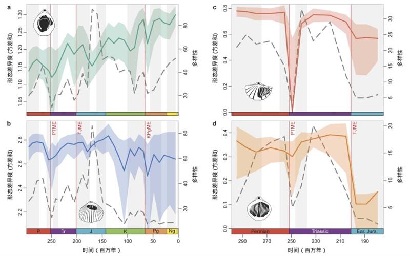 图为中—新生代四个腕足动物目的多样性(虚线)与形态差异度(实线)的变化。(研究团队供图)