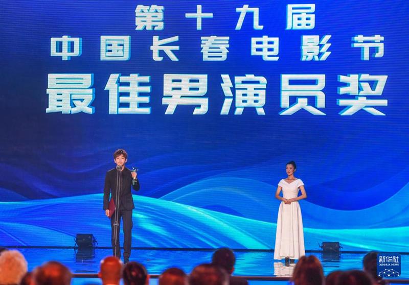 9月1日,彭昱畅(左)发表获奖感言,他凭借《我们一起摇太阳》获得金鹿奖最佳男演员奖。新华社记者 张楠 摄